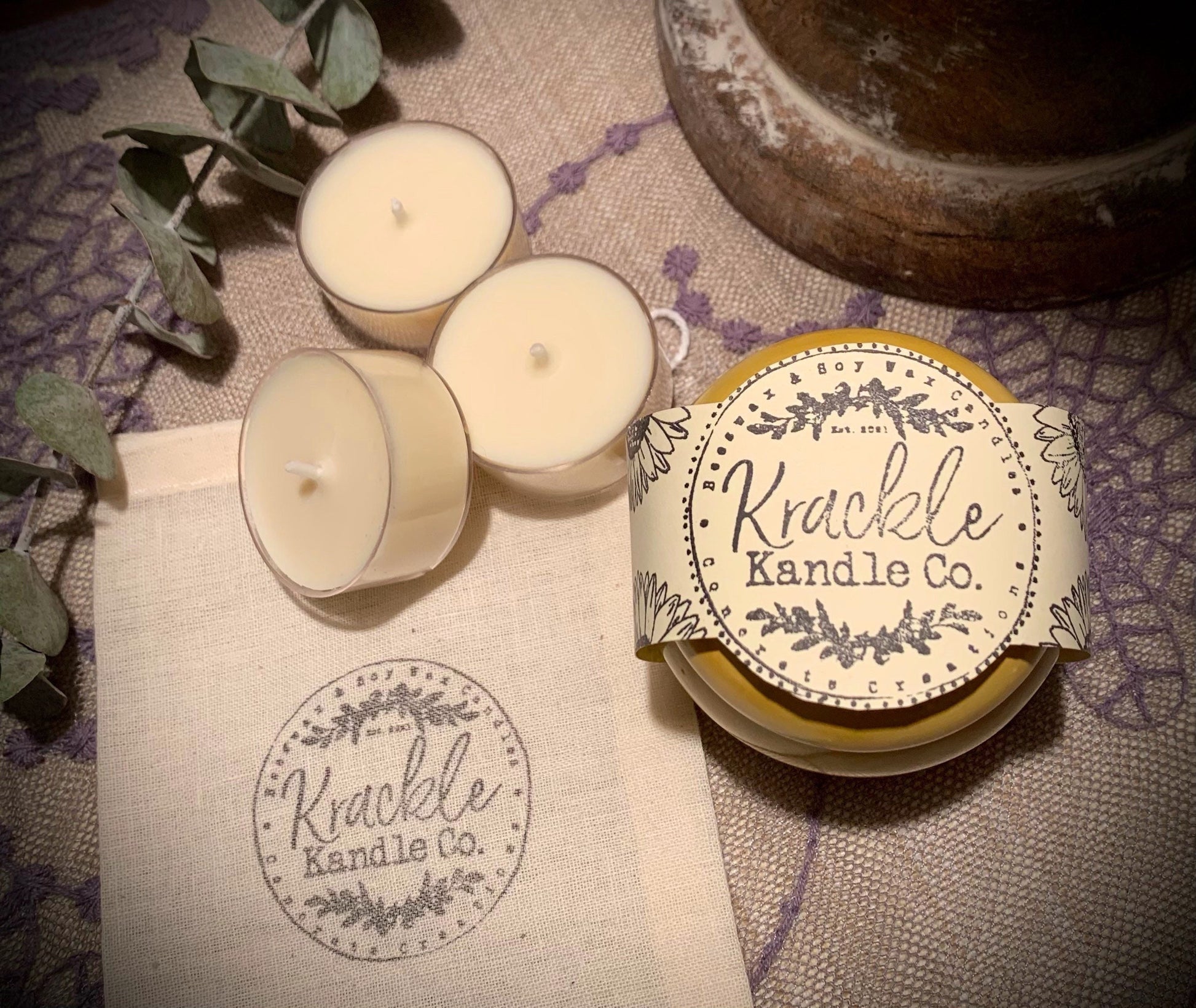 Tea light candles are hand poured using our proprietary blend of soy wax and locally sourced beeswax that is all-natural and free of synthetic waxes. These candles are unscented and do not contain any fragrance oils. They may have a slight honey aroma due to the beeswax.