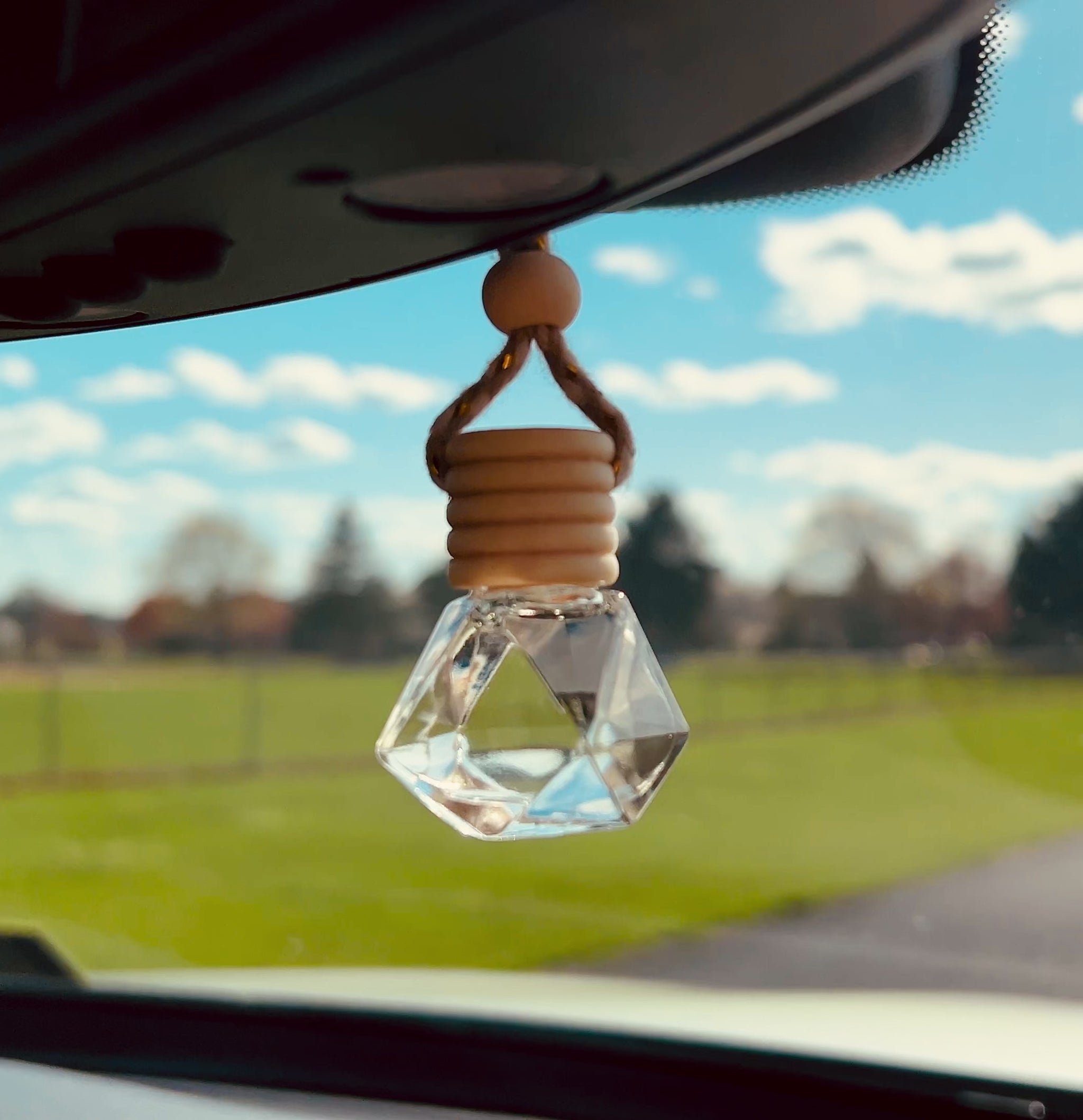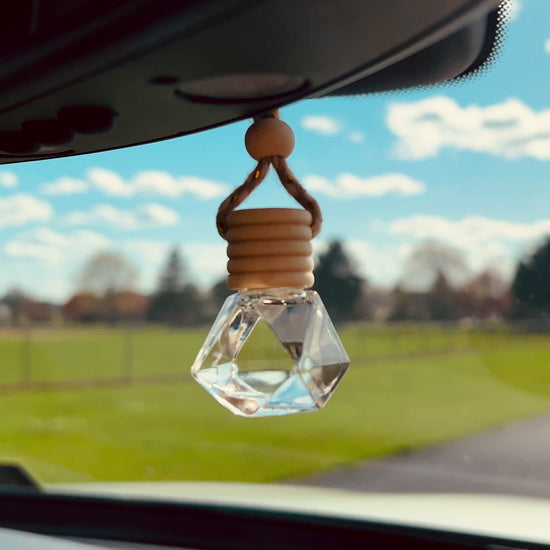 Bring a touch of elegance and freshness to your drive with this beautifully crafted car diffuser. Designed with a natural wooden top and a diamond-shaped glass bottom, this diffuser is both functional and stylish. It hangs securely from a woven cord, accented with a smooth wooden bead for a finished, minimalist look.