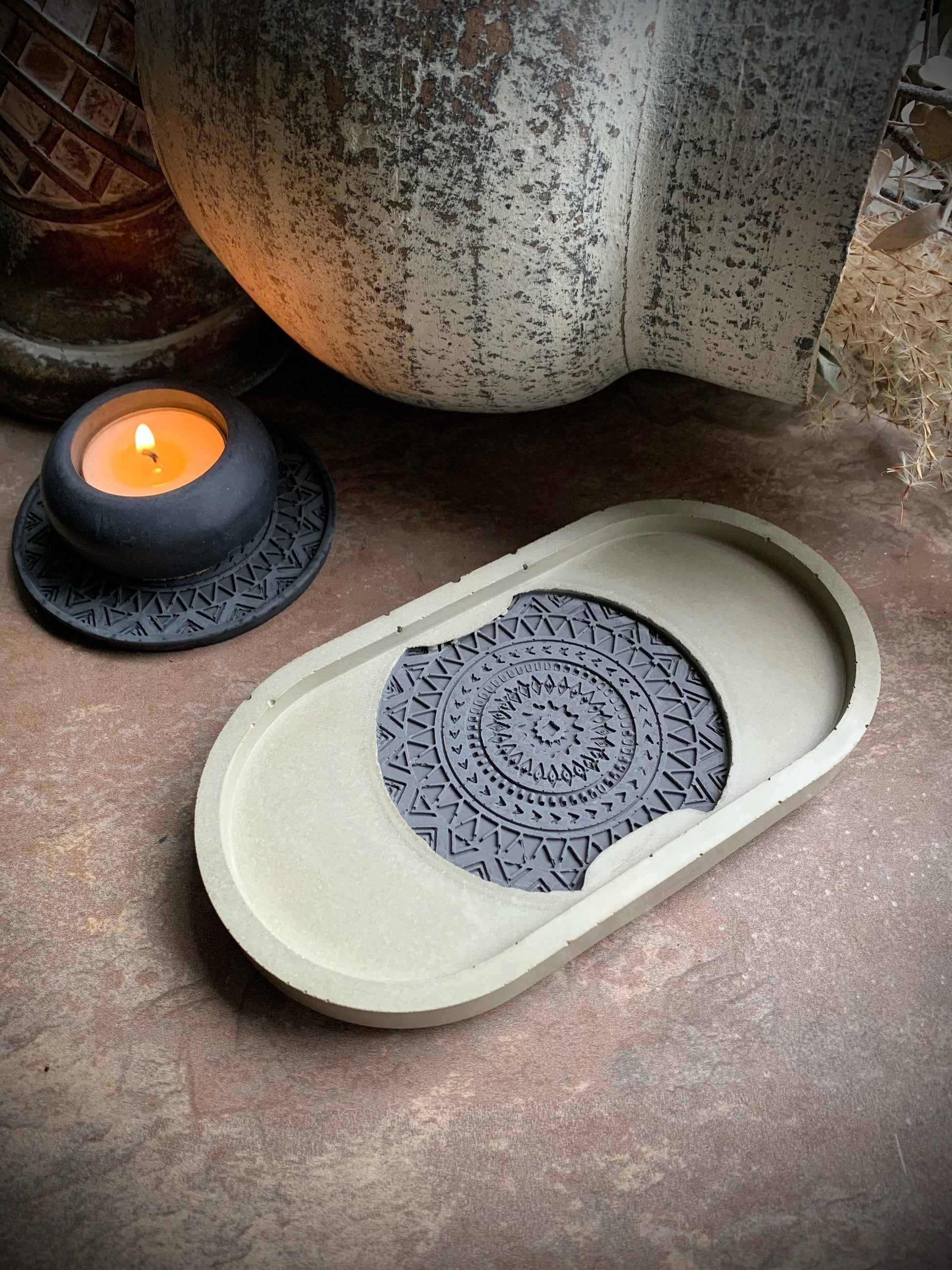 Textured Geometric Concrete Coaster in Concrete Oval Tray