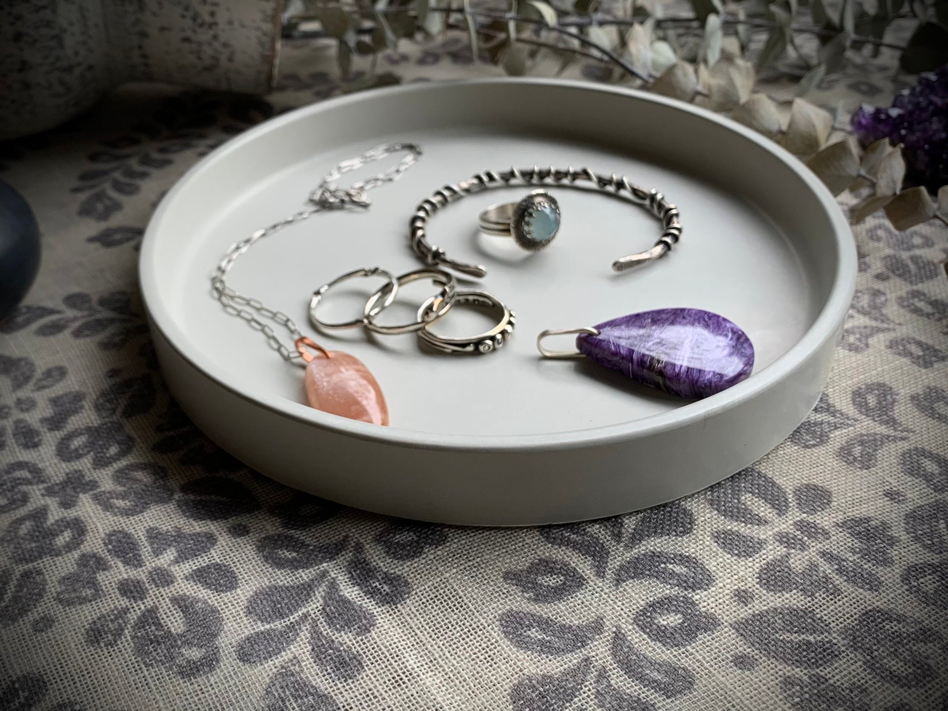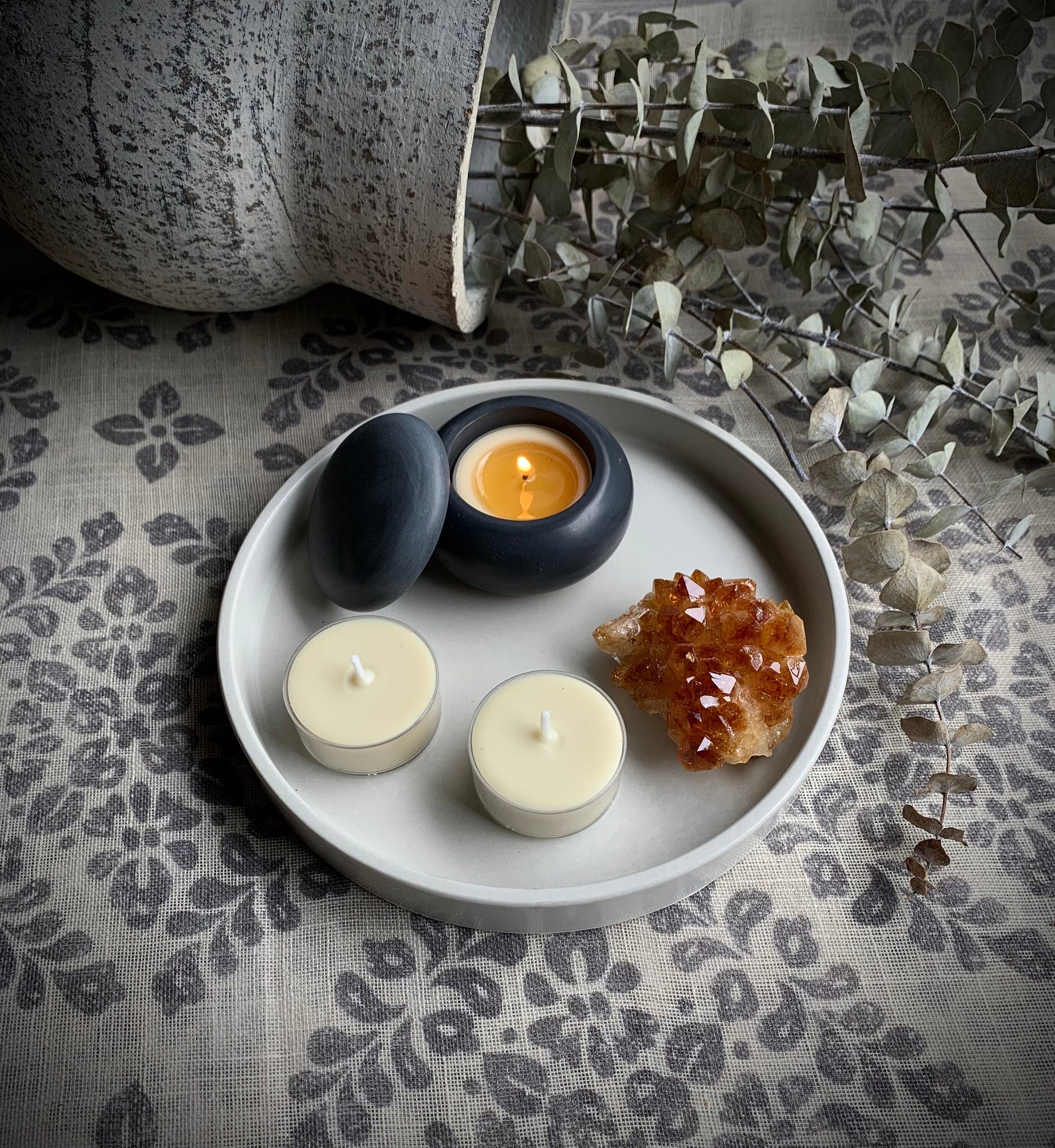 Our concrete trays are made with premium cement mix and non-toxic pure mineral oxide pigments. They are perfect for a variety of reasons including, but not limited to, candle holder, trinket tray, jewelry tray, crystal holder and more.