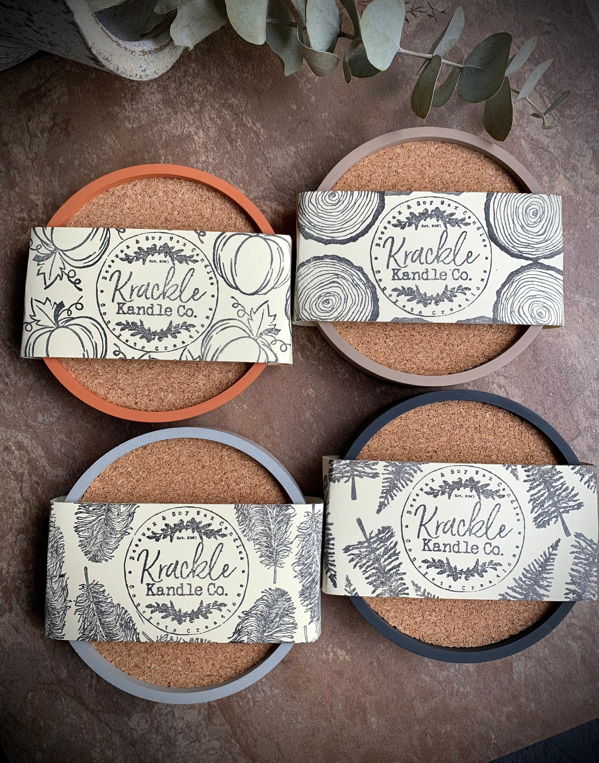 All coasters come with a cork bottom to prevent surface scratches. The cork is stamped with the Krackle Kandle Co. logo using permanent, waterproof ink.